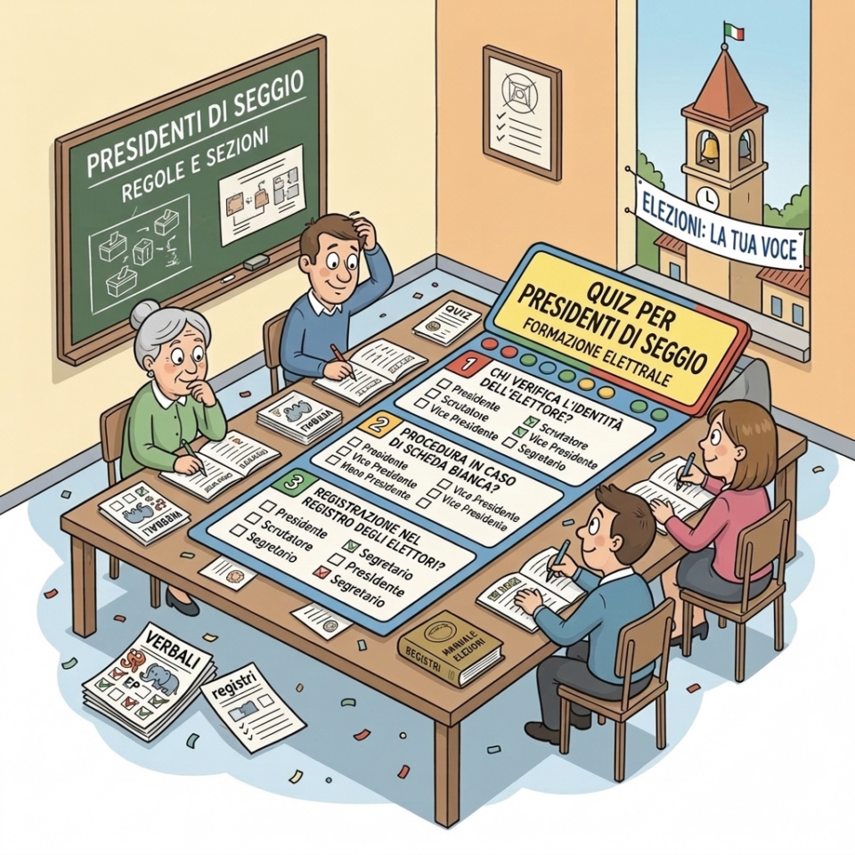 Nelle sezioni del sito troverai tutto l'occorrente per arrivare preparato ed espletare al meglio il compito di Presidente dell'ufficio elettorale di sezione: guide, stampati ufficiali, cartelli, video corsi, materiale vario e quiz interattivi.